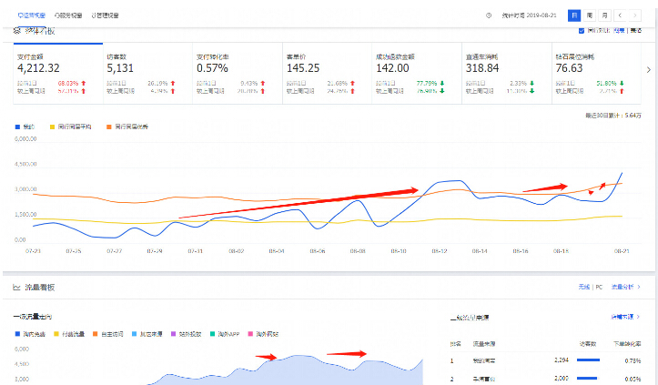 注意:我们在获取优质展现机会的时候,就要注意直通车数据量的累积,前者在于关键词位置排名、人群标签的精准度以及车图点击率,后者在于我们的数据趋势,能否让直通车处于一个稳定递增的状态,这个时候点击量提升后,通过小幅度调关键词出价、人群溢价,拖时间折扣拉低PPC,后面在各项数据优秀的情况下,低价引流且在投产销售额增长的情况下增加预算放大流量带自然搜索。